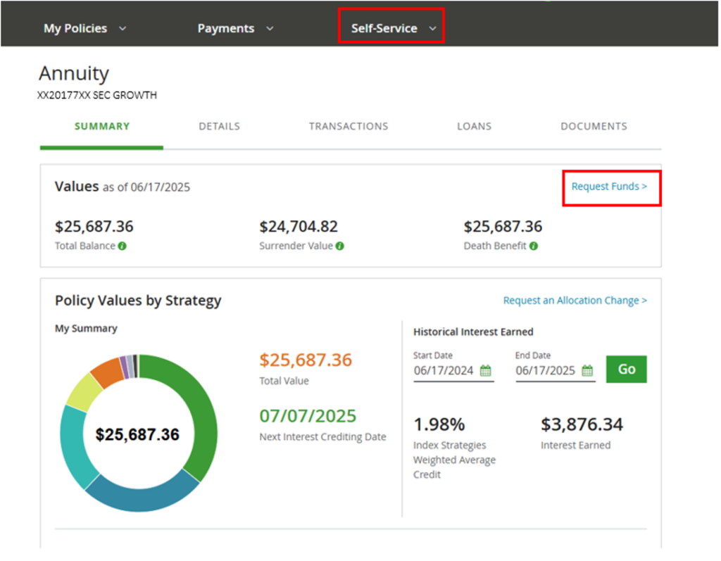 - Navigate to “Self-Service” then “Request Funds.” You will then walk through the steps of requesting your loan or withdrawal.