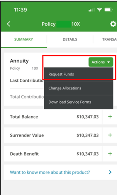 - Select the drop-down menu titled “Action,” then select “Request Funds.” The App will then walk you through the steps of requesting your loan or withdrawal.
